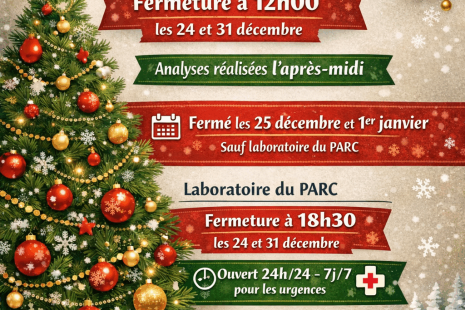 Tous les laboratoires BIOCARMES, à l’exception du laboratoire du PARC, fermeront leurs portes aux patients à 12h00 les 24 et 31 décembre. Les analyses seront… Read More »Information aux patients – Horaires exceptionnels